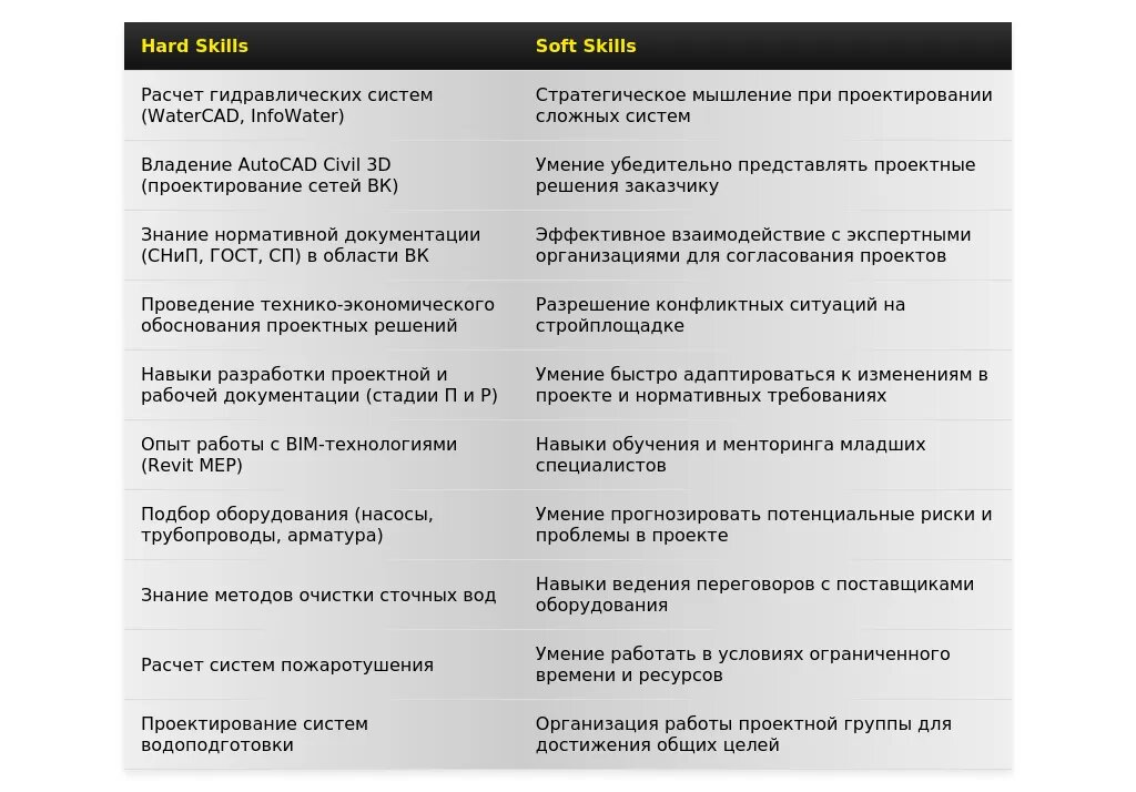 - Профессиональные навыки: Знание нормативной базы, опыт проектирования, выполнение расчетов, разработка чертежей.