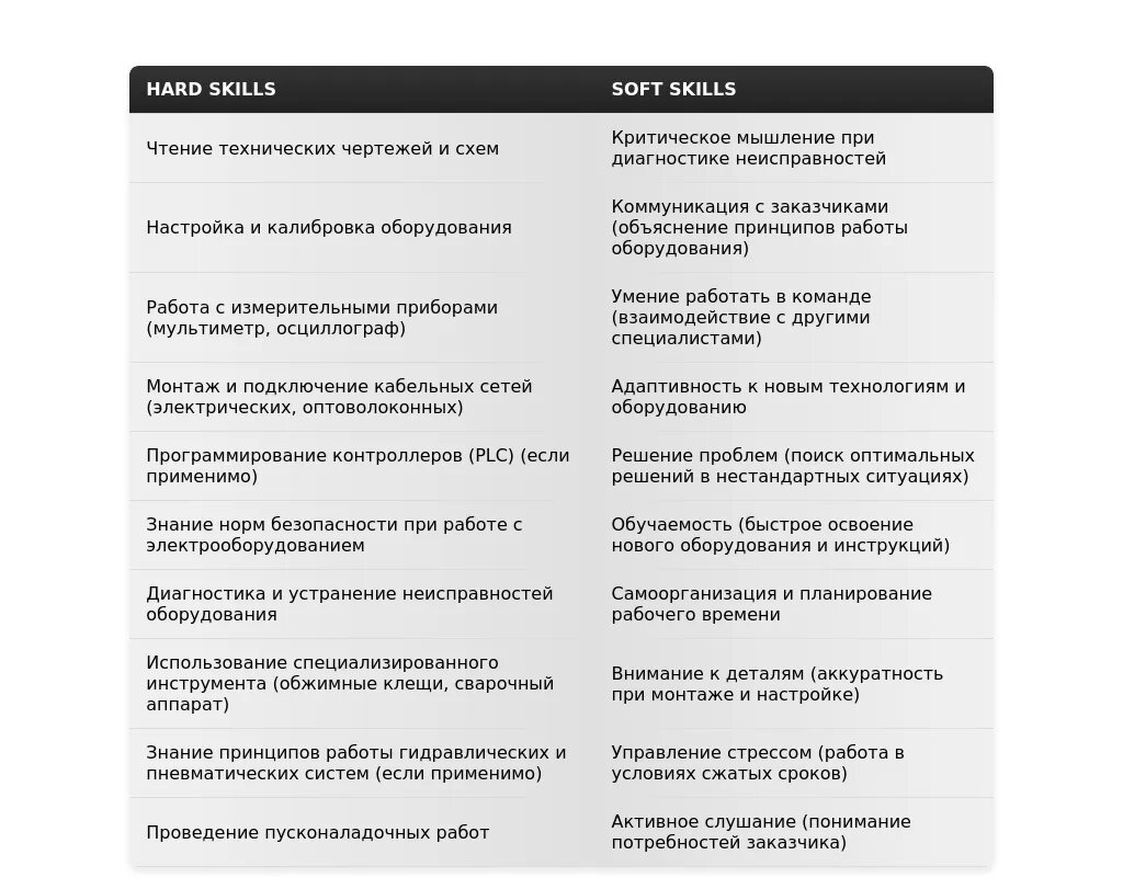 - Установщик электрооборудования: "Монтаж и наладка электрооборудования", "Обслуживание и ремонт электрооборудования", "Работа с электросхемами", "Подключение электрооборудования", "Соблюдение правил электробезопасности", "Группа по электробезопасности".