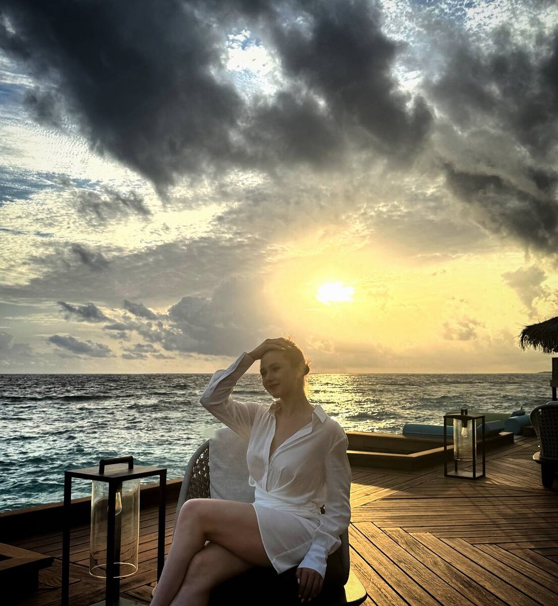 Первая фотография переносит зрителя в атмосферу умиротворяющего заката на Мальдивах. В центре кадра — Камила, одетая в белую одежду, сидящая на деревянной террасе у самого берега моря. На заднем плане раскинулся бескрайний океан, отражающий последние лучи заходящего солнца. Небо украшено драматичными облаками, сквозь которые пробиваются золотистые солнечные лучи, создавая завораживающий контраст света и тени. Стильные уличные фонари на террасе добавляют сцене уюта и элегантности, подчёркивая гармонию между природной красотой и человеческим присутствием.