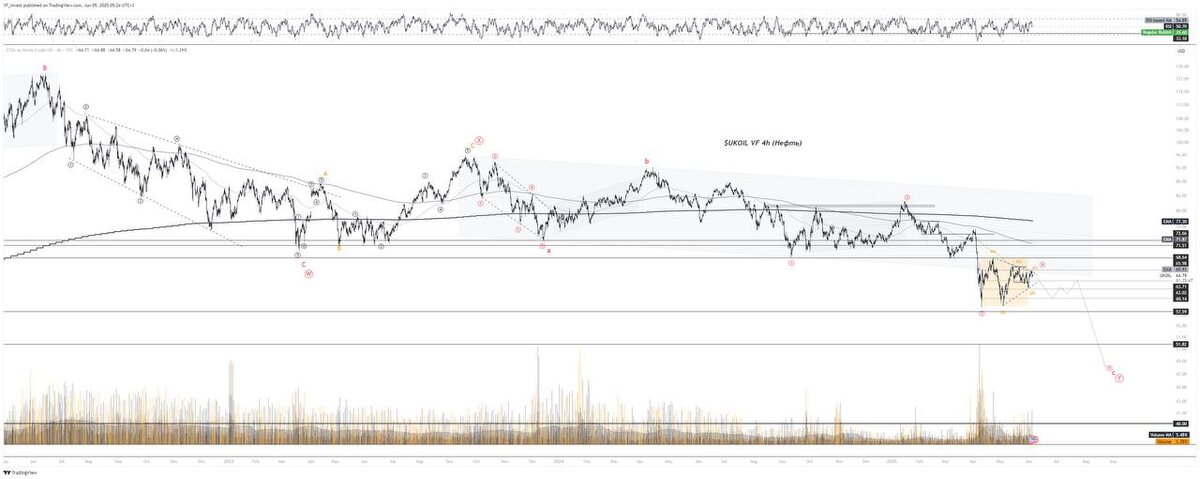$UKOIL (Нефть) VF возвращается. Не писал ничего около 3-4 месяцев, но строго говоря, ничего и не поменялось сильно на рынках. Будет небольшая серия взаимосвязанных постов, чтобы вы понимали мою логику принятия решений, что я делаю сейчас и почему. Начинаем с нефти. Сейчас 64-65, с точки зрения техники торгуется в коррекции 4 волны коррекции. При этом есть несколько вариантов, предположительно это классический треугольник, и либо мы его уже завершили, либо будет еще один заход 65->60->63, и тогда его завершим. Сильно разницы для графика и для техники нет, но второй вариант более "красивый". При этом мы находимся ниже всех скользяшек (50DEMA, 200DEMA, 200WEMA). Их вы можете видеть на графике, чем более жирная - тем более значимая. И последний раз похожая проторговка была в 2020 году, после чего случился ковид и "дно" по нефти. Дополнительно можно посмотреть RSI на недельках. Мы всегда разворачиваемся при нефти ниже 30, а "настоящее" дно на отметках RSI ниже 25. Что это значит? - Что ф
