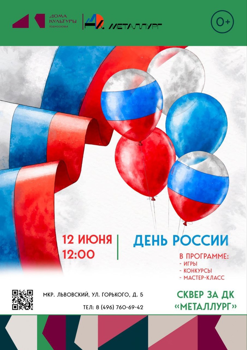 ✨ День России в мкр-не Львовский 🇷🇺 Праздничная программа, посвященная Дню России Для вас патриотические песни, танцы. Подготовлена торжественная программа в честь этого праздника 🔥 🚫 Возраст: 0+ 📆 12.06.2025 🕒 12:00 🏢 Дом культуры «Металлург» (сквер) 📍 г.о. Подольск, мкр-н Львовский, ул. Горького, д. 5 💰 Вход свободный❗️ #webПодольск ⭐Разместить публикацию ⭐Поддержать канал голосом ✅ Мероприятия Подольск https://dzen.ru/id/66ed500f7b5671493eca3fd6 http://vk.com/podolsk_events http://dzen.ru/podolsk_events