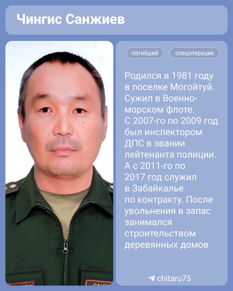 Военный, уволенный в запас, погиб на СВО. Чингис Санжиев в мае 2023 года стал водителем взвода обеспечения войсковой части. Уже в июле он ушел на спецоперацию, погиб в прошлом году 22 ноября. По данным тг-канала администрации Могойтуйского округа 🟦 Подписаться | Предложить новость