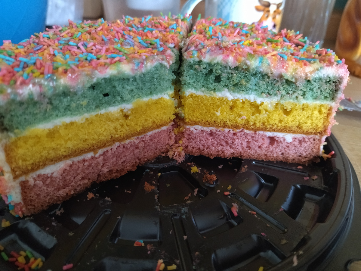 Заранее прошлись с мужем по магазинам, купили торты - один домой и два туда, большой радужный для детей и маленький беленький для родителей.
