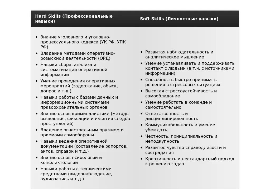 "Знание уголовного, уголовно-процессуального, административного законодательства РФ, знание федеральных законов, регулирующих оперативно-розыскную деятельность. Навыки работы с базами данных, аналитическими программами, специальным программным обеспечением. Водительское удостоверение категории B."