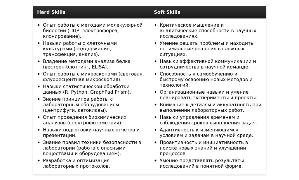 - На какие качества и навыки делать акцент: Внимательность к деталям, аналитическое мышление, умение работать в команде, знание лабораторного оборудования и методик.