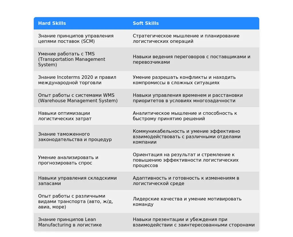 - Сгруппируйте навыки по категориям: Разделите навыки на категории (например, "Транспортная логистика", "Складская логистика", "Программное обеспечение"), чтобы работодателю было легче оценить ваши компетенции.
