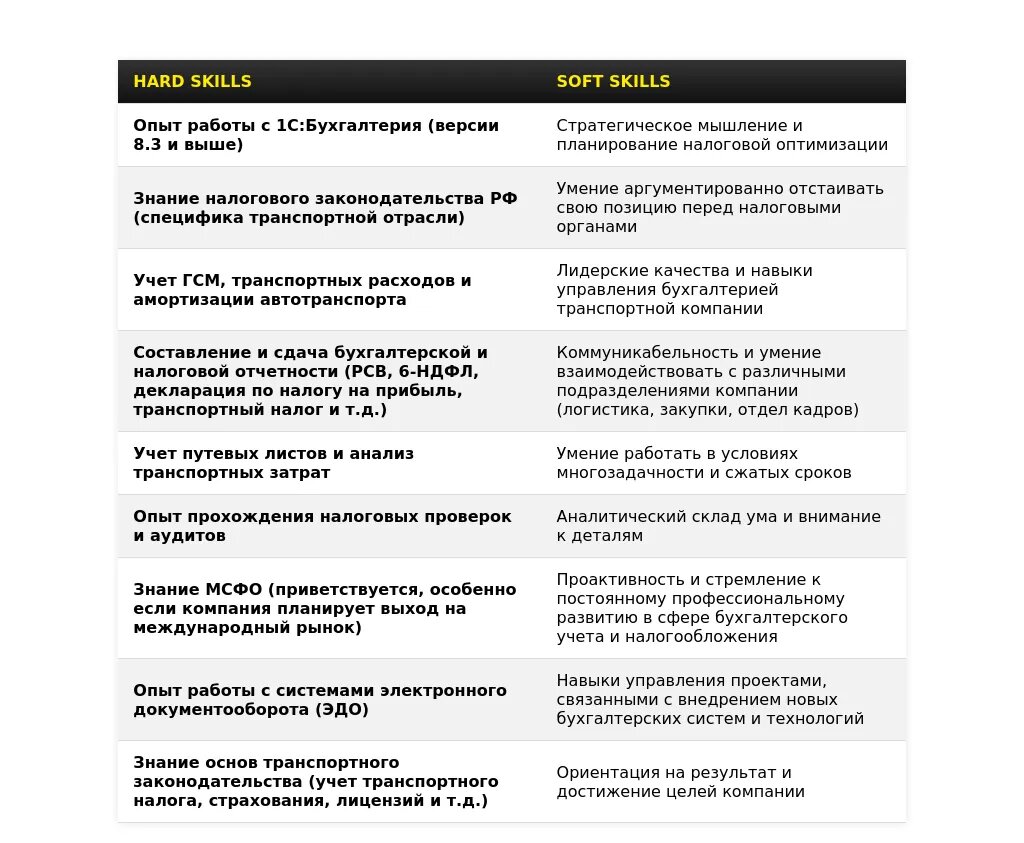 - Указаны ли навыки, необходимые для работы в транспортной компании?
