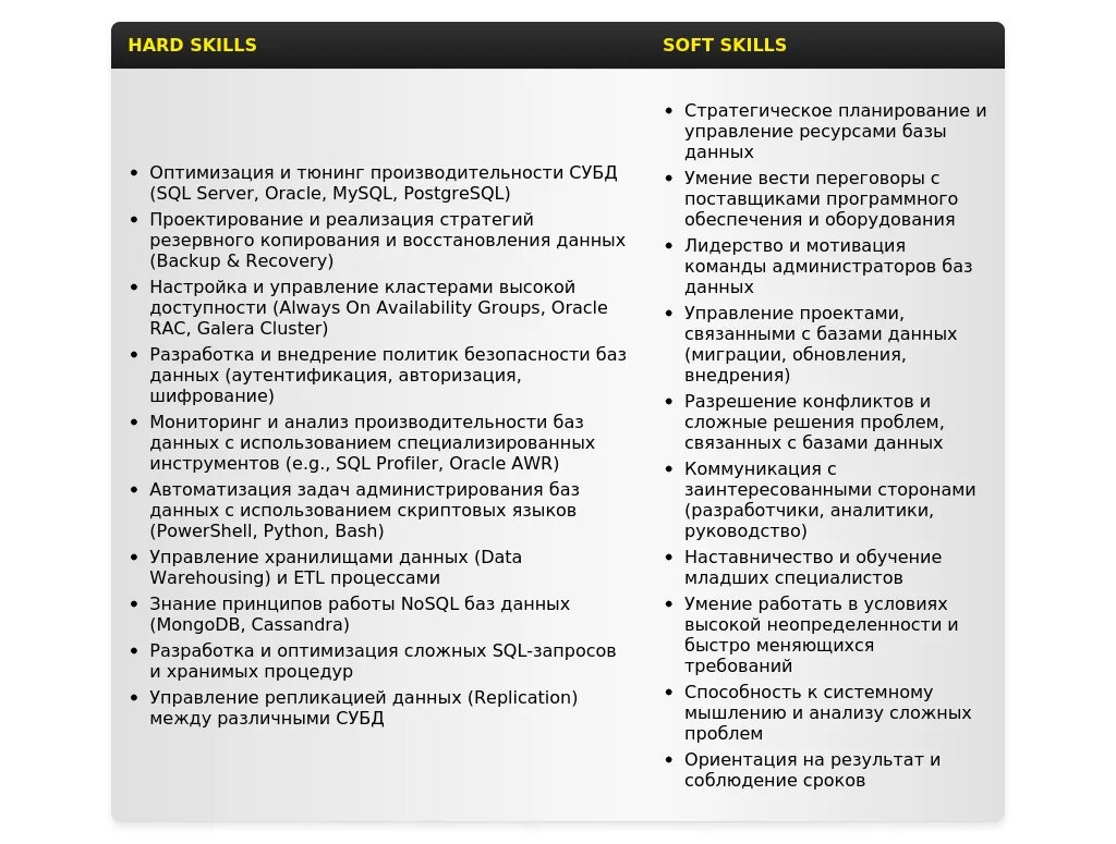 - Специализация: Администрирование, Оптимизация, Резервное копирование, Восстановление, Безопасность, Миграция, DevOps, Highload.