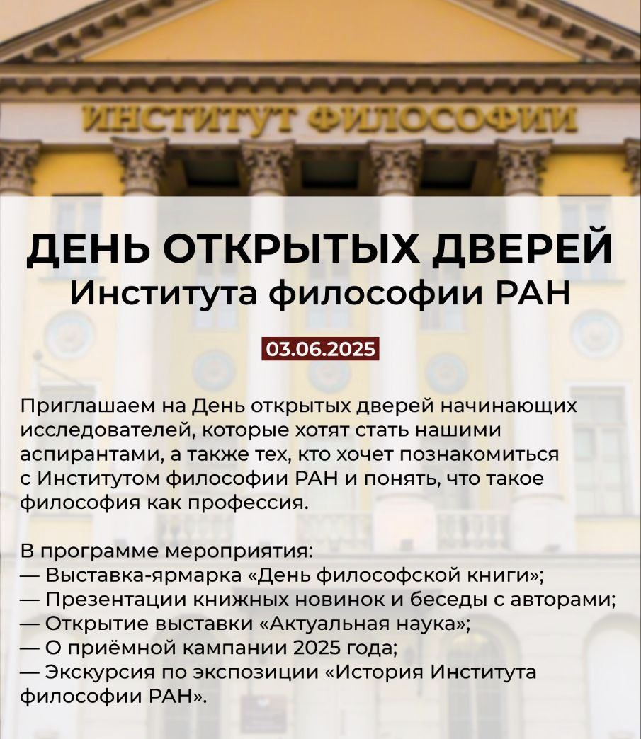 Мы благодарим всех посетивших День открытых дверей Института философии РАН и напоминаем, что Научно-образовательный центр осуществляет консультирование желающих поступить в аспирантуру по пятницам с 12:00 до 17:00 (или в предварительно согласованное время).
