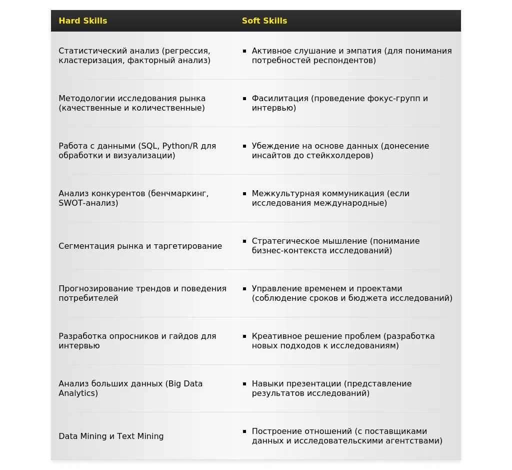 Разделите навыки на категории (например, "Инструменты анализа", "Методы исследования", "Soft skills"). Перечислите навыки в порядке убывания их важности для конкретной вакансии. Используйте ключевые слова из описания вакансии.