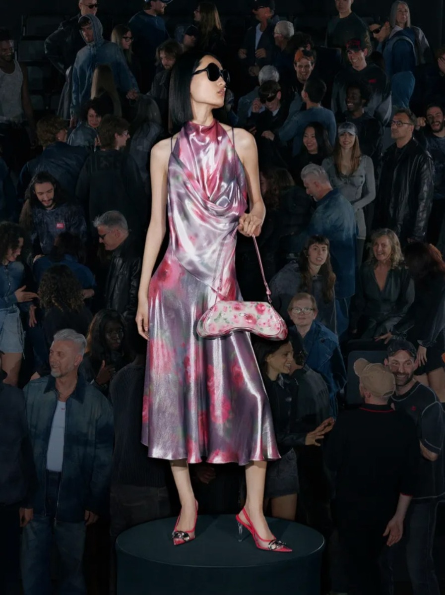 Похоже, подросток по имени Diesel начал вдруг задумываться о вине, налогах и правильной спине. Не факт, что он повзрослел, но в его гардеробе определённо появилась прямая спина и запах «что-то по корпоративной дресс-кодной части». Уж не призрак ли Business Casual по ночам навещает Гленна Мартенса? Хотя на дворе всё ещё мода, где у девочек — триколорные брови, у мальчиков — рваный деним с отрывком из романа Франзенa на попе, а у Diesel — новая эпоха. Она всё ещё хочет тусить, но уже знает, как выглядит слово «контекст». И да, оно с галстуком. Гленн Мартенс, человек, одновременно работающий над кутюрным показом для Margiela и куртками с эффектом «да это просто джинса», как будто решил, что жить — значит уметь сочетать несовместимое. Кутюр и уличную пыль. Скульптурный силуэт и дворовый вайб. Коктейльные платья, в которых можно и на премьеру, и на вечеринку после неё, где главный гость — непредсказуемость. Когда Neoprene изображает деним, а джинсовая ткань делает вид, будто она старая до