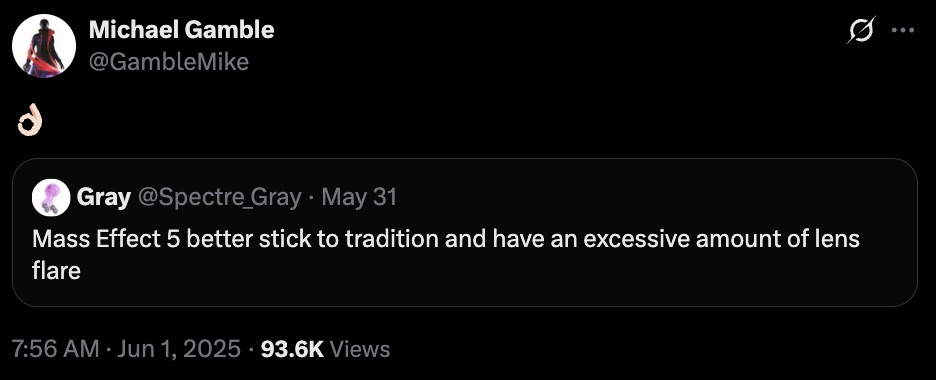Геймдиректор следующей части Mass Effect Майкл Гэмбл намекнул, что новая игра может продолжить традицию франшизы по обильному использованию эффектов линзовых бликов (lens flare). Отвечая на пост в социальных сетях с текстом "Mass Effect 5 должна придерживаться традиций и иметь чрезмерное количество линзовых бликов", Гэмбл просто ответил эмодзи "окей". Хотя это далеко от официального подтверждения, реакция разработчика может указывать на то, что разработка игры продвигается... по крайней мере стабильно. Стоит отметить, что согласно отчетам от начала этого года, новая Mass Effect ещё не вошла в стадию полномасштабного производства. По словам бывшего продюсера BioWare Марка Дарры, в январе игра всё ещё находилась на ранних этапах разработки, так как студия была занята поддержкой Dragon Age: The Veilguard. Так как BioWare превратилась в студию, работающую над одним тайтлом за раз, это означает отсутствие высоких темпов разработки Mass Effect. Что точно известно о разработке следующей Mass