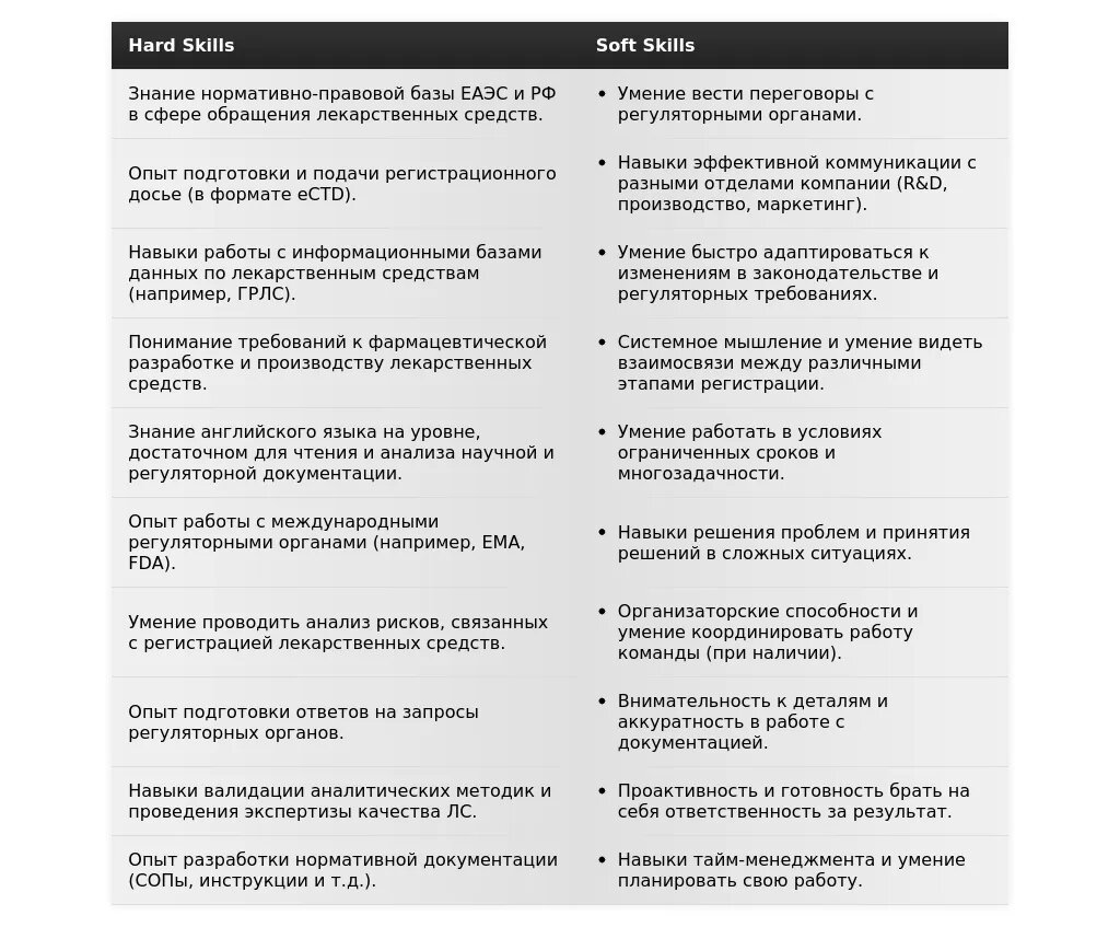 - Фармацевтическая регистрация: Опыт работы с регистрацией лекарственных средств, БАДов или медицинских изделий.