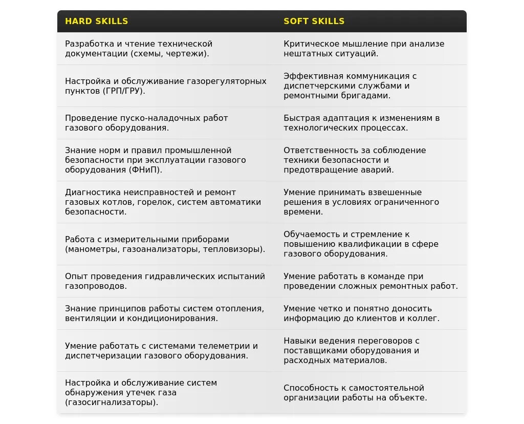 Навыки: *__Организация и управление бригадой__*, *__Разработка и внедрение инструкций по эксплуатации газового оборудования__*, *__Взаимодействие с надзорными органами (Ростехнадзор)__*, Знание нормативной документации (ФЗ-116, ПБ 12-529-03), Опыт проведения аудитов по промышленной безопасности, Лидерские качества, Ответственность.