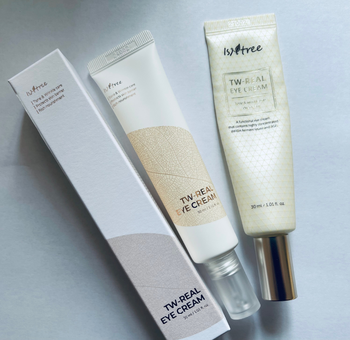 Добрый день, дорогие мои. Сегодня мы разберем крем для кожи вокруг глаз Tw-Real Eye Cream от производителя IsNtree. Крем в объеме 30 мл можно купить от 1000 рублей в Золотом яблоке, Ozon, Hollyshop. И в оффлайн магазинах Летуаль, и др. Крем для кожи вокруг на 61% состоит из ферментированного лизата бифидобактерий, который содержит большое количество белка, сахаридов и витаминов. Он способствует укреплению защитного кожного барьера нежной кожи век. Ниацинамид и аденозин осветляют темные круги под глазами и повышают эластичность кожи. Натуральные растительные масла (Ши, манго) интенсивно питают кожу. Состав большой, 64 ингредиента. Основа средства вода, значит средство направлено на увлажнение. А вот вторым средством в составе является бутиленгликоль, это безопасный химический спирт, его часто используют в косметике как связующее звено. Далее идет синтетический растворитель. И натуральный увлажнитель глицерин. И затем в составе присутствует опасный синтетический компонент циклопентас