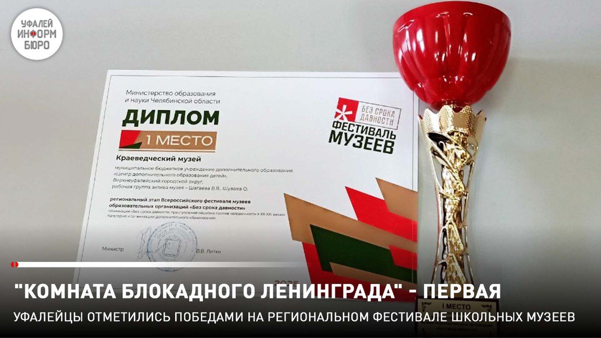 Уфалейские школьники – победители регионального этапа фестиваля "Без срока давности". На региональном этапе всероссийского фестиваля школьных музеев «Без срока давности» победу одержала команда краеведческого музея «ЦДОД» под руководством Валимы Шагаевой. В категории «Организации дополнительного образования» музейная экспозиция «Комната блокадного Ленинграда» заняла первое место в номинации «Без срока давности: преступления нацизма против человечности в ХХ–XXI веках». Жюри рекомендовало эту работу для участия во Всероссийском фестивале музеев образовательных организаций «Без срока давности». Второе место в категории «Общеобразовательные организации» заняла команда школьного музея гимназии №7 «Ступени» под руководством Ольги Конюховой. Участники из Верхнего Уфалея стали призёрами в номинации «Деятельность поисковых отрядов и общественных организаций/движений в мероприятиях по сохранению памяти о жертвах военных преступлений нацистов и их пособников среди мирного населения в годы Велик