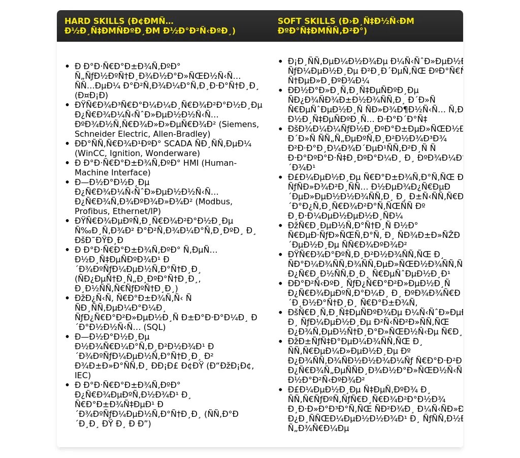 Разделите навыки на категории (например, "Программирование PLC", "SCADA-системы", "Протоколы связи") и расположите их в порядке убывания важности для данной вакансии.