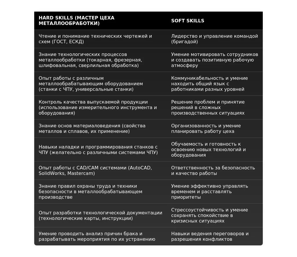 Ключевые навыки и компетенции, релевантные для позиции мастера цеха металлообработки.