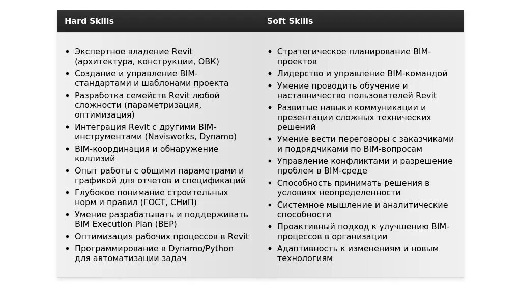 - На какие качества и навыки делать акцент: Знание Revit, понимание BIM-процессов, умение работать в команде, аналитические способности, внимание к деталям, ответственность, обучаемость.