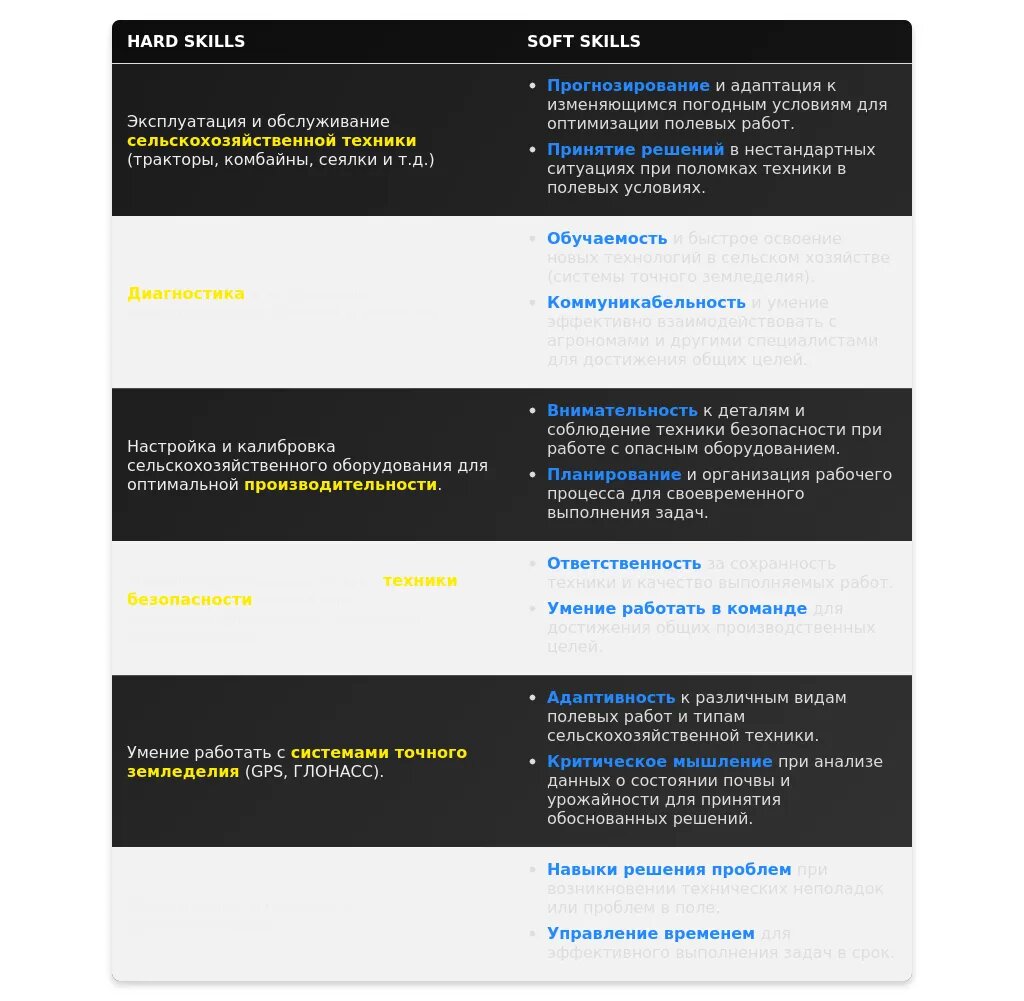 - Для вакансий в агрохолдингах: "Опыт работы с импортной техникой", "Знание систем точного земледелия", "Работа с GPS-навигацией", "Повышение урожайности", "Оптимизация затрат".