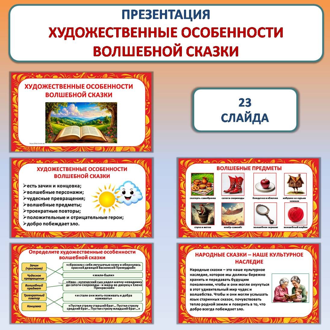Презентация «Художественные особенности волшебной сказки» разработана к уроку литературного чтения в 3 классе. Будет полезна в 4 и 5 классах на этапе повторения. Презентация состоит из 23 слайдов. Слайды № 17, 18, 19, 20, 21 анимированы. По щелчку мыши появляются ответы. Слайд № 1. Титульный слайд. Слайд № 2. Что такое сказка. Слайд № 3. Виды сказок - схема. Слайд № 4. Сказки волшебные, бытовые, о животных. Слайд № 5. Виды сказок - схема. Слайд № 6. Народные и литературные сказки. Слайд № 7. Художественные особенности волшебной сказки. Слайды № 8. Композиция волшебной сказки. Слайды № 9 - 10. Волшебные персонажи. Слайд № 11. Волшебные предметы. Слайд № 12. Чудесные превращения. Слайды № 13 - 16. Язык волшебной сказки. Слайд № 17. Определите художественные особенности волшебной сказки. Слайды № 18 - 21. Угадайте сказки. Слайд № 22. Народные сказки – наше культурное наследие. Слайд № 23. Цитата А.С. Пушкина «Сказка ложь, да в ней намек! Добрым молодцам урок». Презентацию скачать здесь