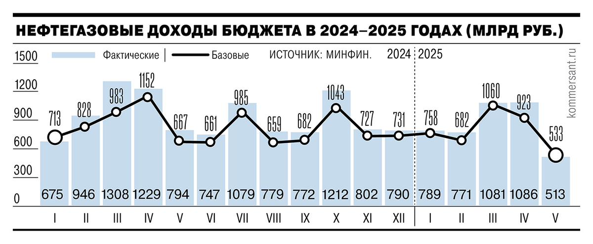 Последствия торговых войн г-на Трампа (на которого в России принято возлагать большие надежды) и переукрепления рубля уже в полной мере ощущаются на российском бюджете. Из-за сильного падения цены на нефть, которое было вызвано, прежде всего, действиями Трампа, нефтегазовые доходы российского бюджета в мае рухнули аж на 35% в годовом выражении, составив всего чуть более 500 млрд рублей, если быть точнее - 513 млрд. Это минимальный уровень всех последних лет. Просто для сравнения, еще в марте и апреле сбор нефтегазовых доходов превышал 1 трлн рублей, был примерно вдвое больше. Ну а минимальный уровень последних лет составлял около 800 млрд. Максимальный - более 1300 млрд. И вот бац, 500. Тут даже о высокой расчетной базе говорить не приходится, потому что в мае 2024 было собрано 794 млрд доходов (это вблизи прошлогодних минимумов). Вот как все это выглядит на инфографике от издания "Коммерсант". Помимо торговых войн и обрушения, в связи с этим, цены барреля нефти в долларах, на падение