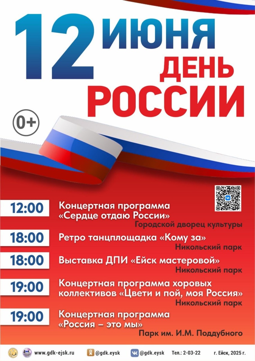 12 июня — День России! В Ейском городском дворце культуры в 12:00 пройдет концерт «Сердце отдаю России». Никольский парк: ▫ 18:00 — ретро-площадка «Кому за». ▫ 18:00 — выставка декоративно-прикладного искусства «Ейск мастеровой». ▫ 19:00 — концерт хоровых коллективов «Цвети и пой, моя Россия». В парке им. И.М. Поддубного в 19:00 начнётся концертная программа «Россия — это мы». #ДеньРоссии