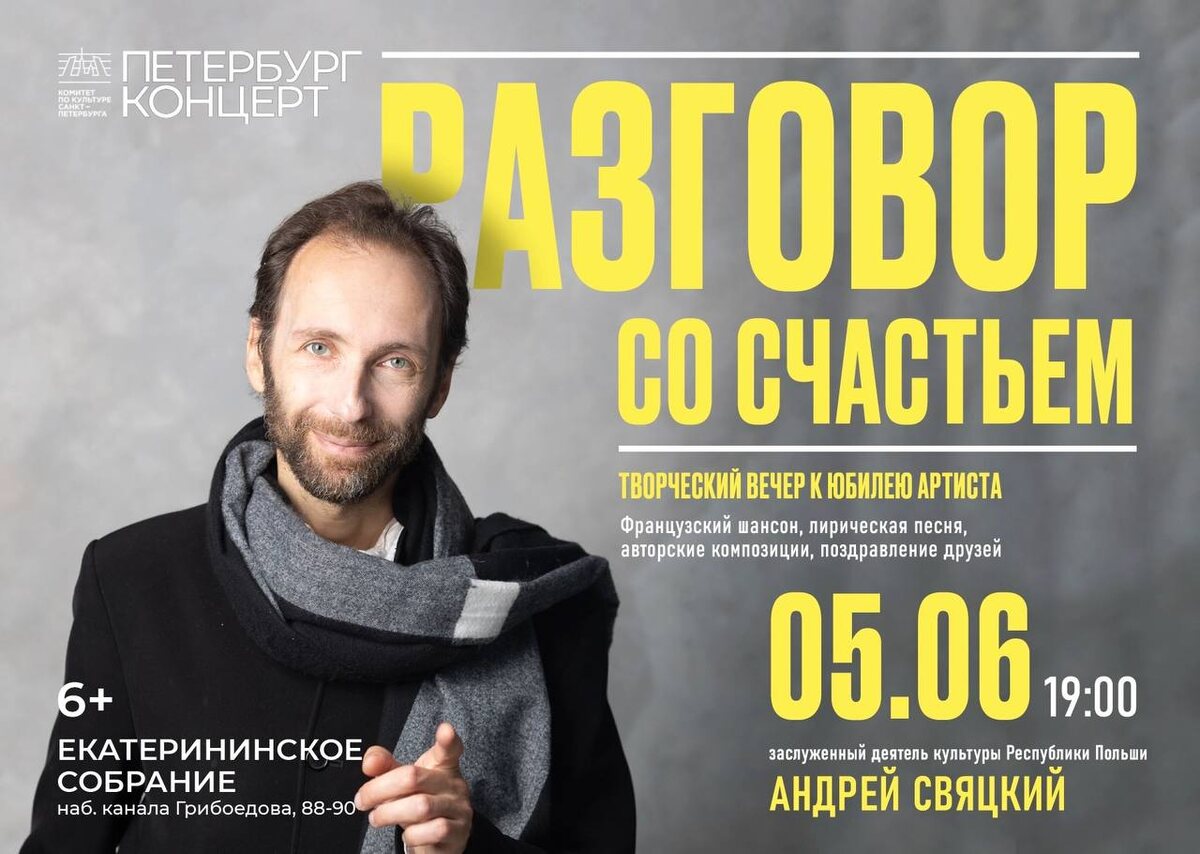 Присоединяйтесь к прямой трансляции творческого вечера «Разговор со счастьем» уже через час! Лауреат и обладатель Гран-при конкурсов русского романса, солист «Петербург-концерта» Андрей Свяцкий приглашает в Большой зал Екатерининского собрания на «Разговор со счастьем». В программу юбилейного творческого вечера вошли любимые мелодии вокалиста: французский шансон, лирические шлягеры советской киноклассики, песни из репертуара Муслима Магомаева, арии из знаменитых оперетт и авторская песня. В этот вечер вместе с Андреем Свяцким на сцену выйдут его друзья: заслуженный артист Российской Федерации Олег Вайнштейн (фортепиано), лауреат международных конкурсов Сергей Зыков (баритон), актриса Анна Шмелёва, мастер художественного слова Василий Соловьёв-Седой (младший). Смотрите эксклюзивно в VK Видео! Прямая трансляция доступна в нашем сообществе ВКонтакте. Присоединяйтесь!