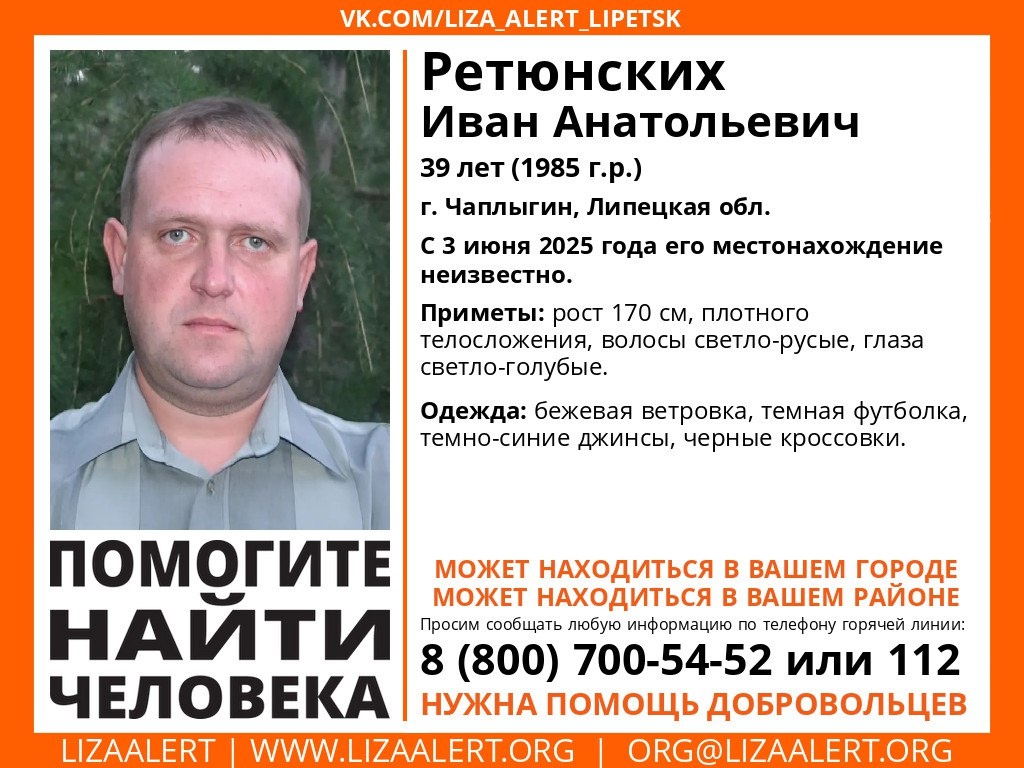 В Липецкой области ищут пропавшего 39-летнего Ивана Анатольевича Ретюнских. В минувший вторник, 3 июня, мужчина вышел из дома в Чаплыгине и не вернулся. С того момента о местонахождении Ивана Анатольевича ничего не известно. Об этом сообщили в региональном отделении поисково-спасательного отряда «Лиза Алерт». Приметы чаплыгинца: рост 170 сантиметров, телосложение плотное, светло-русые волосы и светло-голубые глаза. В день исчезновения Иван Ретюнских был одет в бежевую ветровку, темную футболку, темно-синие джинсы и кроссовки черного цвета. Если вы видели пропавшего мужчину или что-то знаете о его возможном местонахождении, то сообщите об этом по телефонам — 112 или 8 (800) 700-54-52.