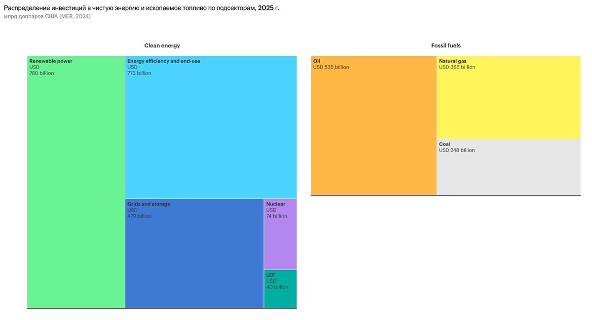 Глобальные инвестиции в энергетику вырастут до $3,3 трлн в 2025 году, говорится в отчёте МЭА. Ключевой тезис, динамика инвестиций показывают, что приближается новая Эра Электричества. По мнению агентства, данный факт отражает не только усилия по сокращению выбросов, энергетическая безопасность становится ключевым фактором роста мировых инвестиций в этом году. Десять лет назад инвестиции в ископаемое топливо были на 30% выше, чем в генерацию электроэнергии, сети и хранение. Сегодня ситуация обратная - инвестиции в электроэнергетику на 50% выше, чем общая сумма, потраченная на "доставку нефти, природного газа и угля на рынок". Инвестиции в чистые технологии — ВИЭ, ядерную энергетику, сети, хранение, топливо с низким уровнем выбросов, эффективность и электрификацию — в этом году должны достичь рекордных $2,2 триллионов Инвестиции в нефть, природный газ и уголь должны достичь $1,1 триллиона. - инвестиции в солнечную энергетику достигнут $450 миллиардов - инвестиции аккумуляторы превы