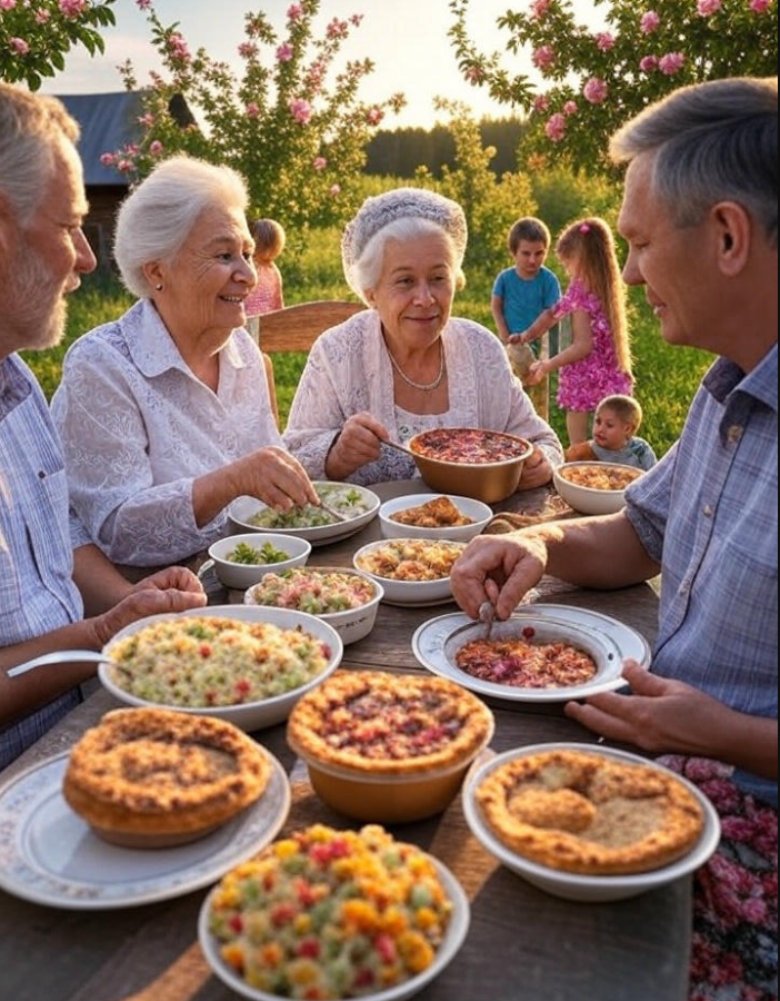 Во дворе суетились родственники. Трое детей — Сергей, Лена и Андрей — приехали с семьями, привезли семерых внуков и двух правнуков. Из Новосибирска прикатила тётя Валя, сестра Анны Петровны, с мужем и внучкой. Стол во дворе ломился от еды: пироги с картошкой и капустой, холодец, нарезка из домашней колбасы, миски с «Оливье» и «Селёдкой под шубой». В центре красовалась огромная кастрюля с борщом, который Анна Петровна варила с утра.