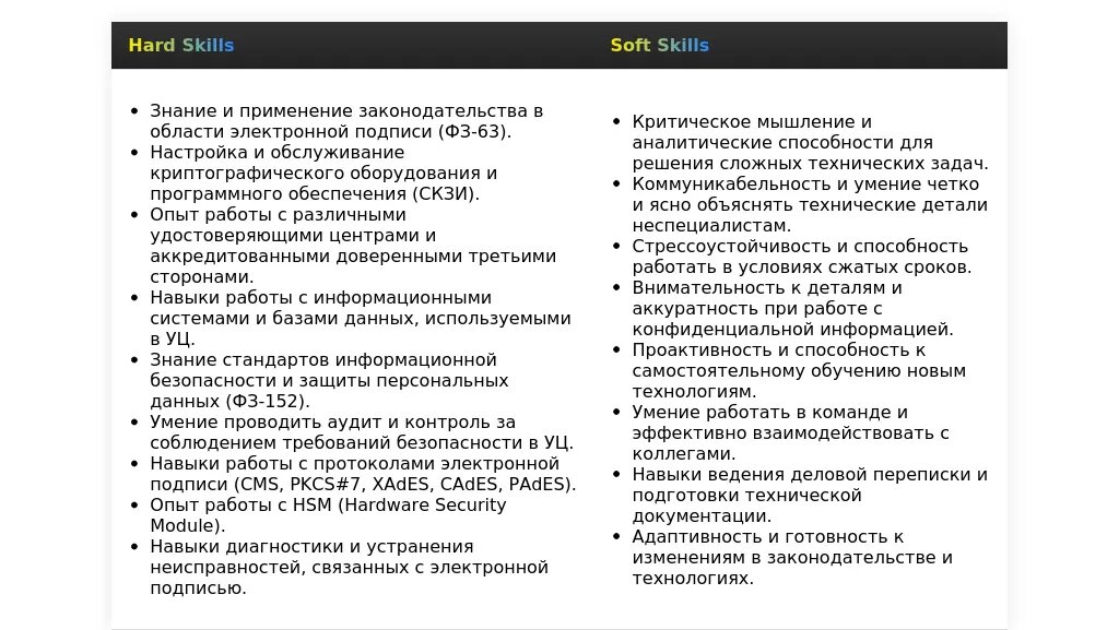 - Знание законодательства в сфере электронной подписи.