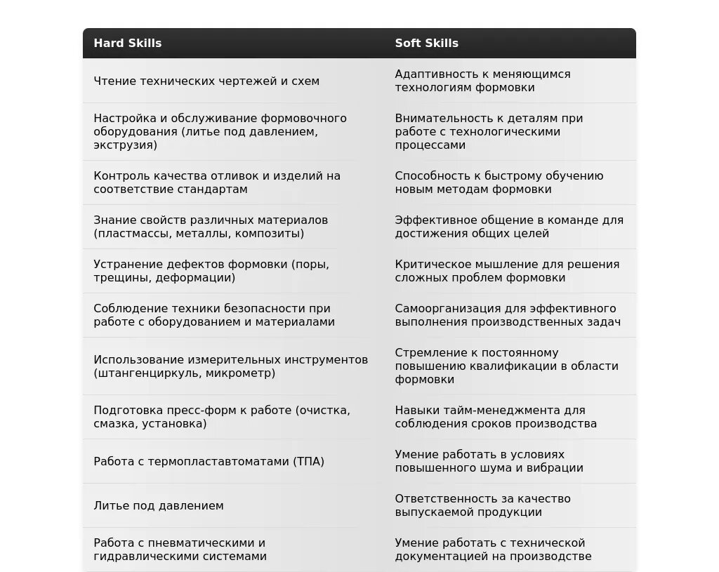 - Для вакансий, связанных с машинной формовкой: "Опыт работы на формовочных машинах (указать конкретные модели)", "Наладка и обслуживание формовочного оборудования", "Контроль качества отливок".