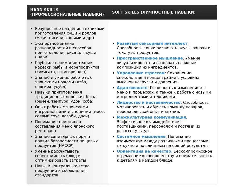 "Профессиональные навыки: Приготовление блюд кайсэки, суши и темпуры (экспертный уровень), разработка авторских рецептов, знание традиционных техник японской кухни, знание японских ингредиентов и продуктов. Управленческие навыки: Составление меню, управление командой из 10+ поваров, контроль качества на всех этапах приготовления, оптимизация затрат. Личные качества: Креативность, ответственность, страсть к японской культуре и кулинарии."