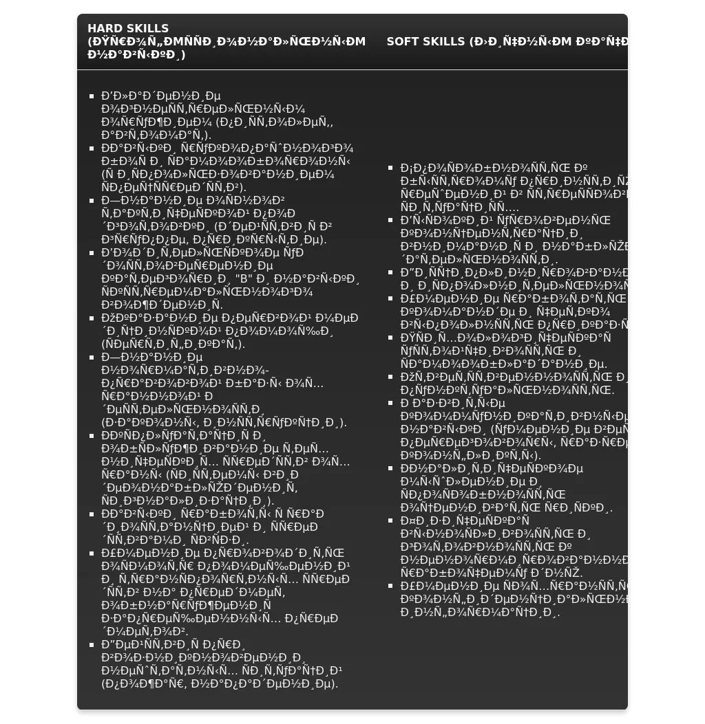 Используйте ключевые слова из описания вакансии в разделе "Навыки". Это поможет вашему резюме пройти автоматический отбор на сайтах по поиску работы и привлечет внимание работодателя.