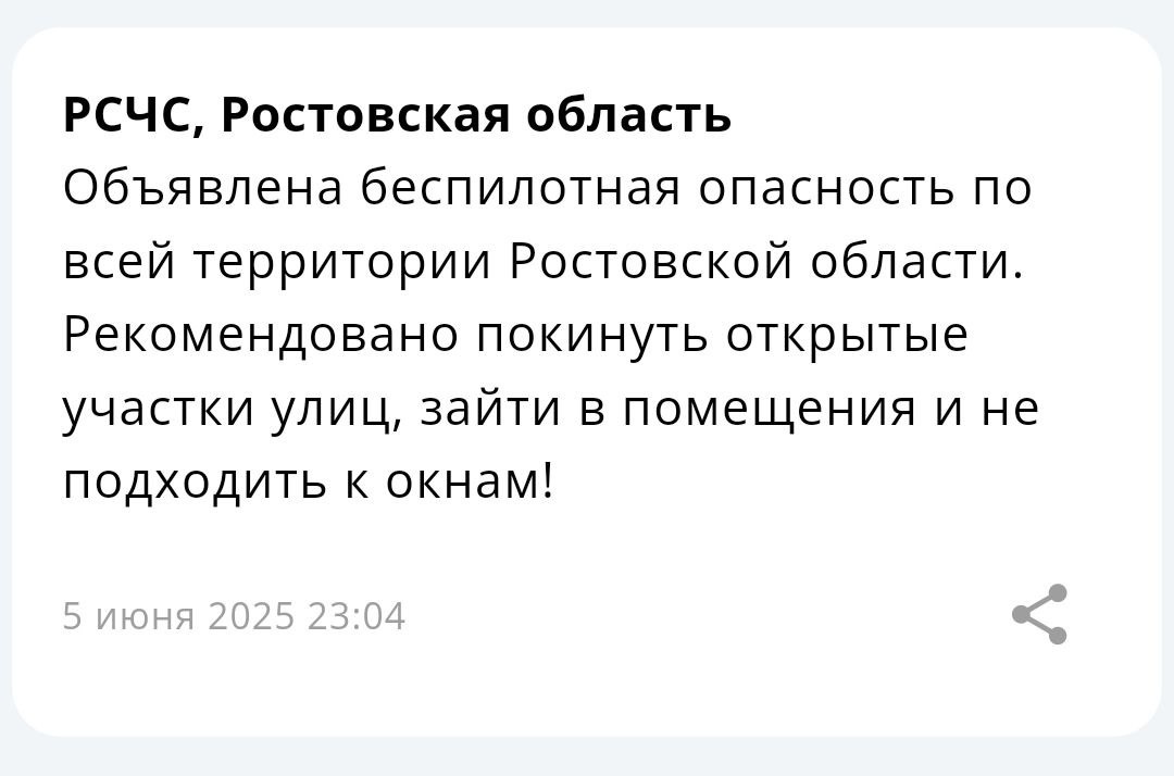 ‼️ Экстренная информация РСЧС: Объявлена беспилотная опасность по всей территории Ростовской области. Рекомендовано покинуть открытые участки улиц, зайти в помещения и не подходить к окнам!