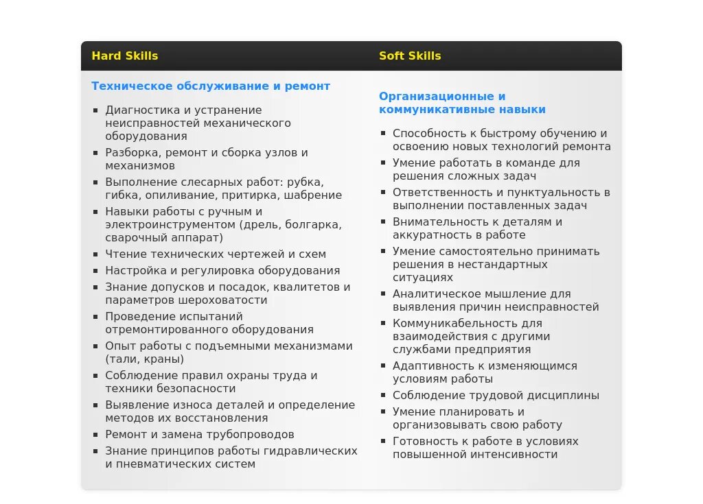 - Производство: "Обслуживание и ремонт промышленного оборудования", "Выполнение планово-предупредительных ремонтов", "Модернизация оборудования", "Увеличение производительности".