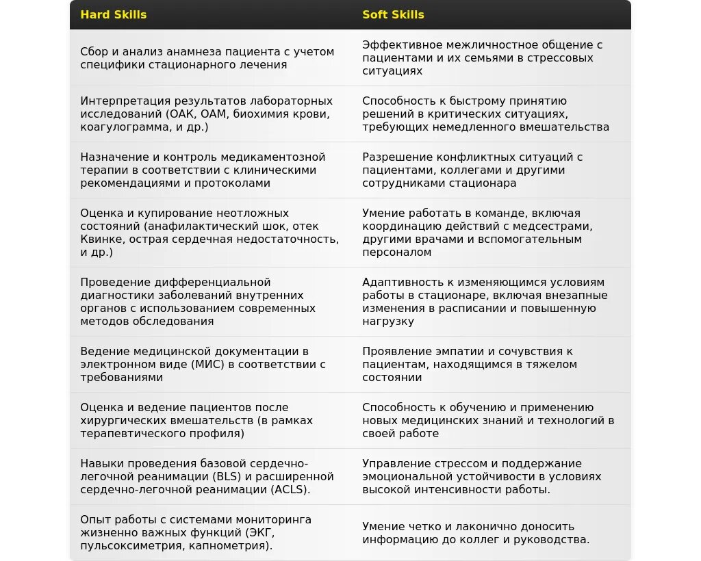 Раздел "Навыки" – это место, где вы можете продемонстрировать свои профессиональные компетенции и знания. Для врача-терапевта стационара важно указать навыки, которые соответствуют требованиям вакансии и отражают вашу специализацию.