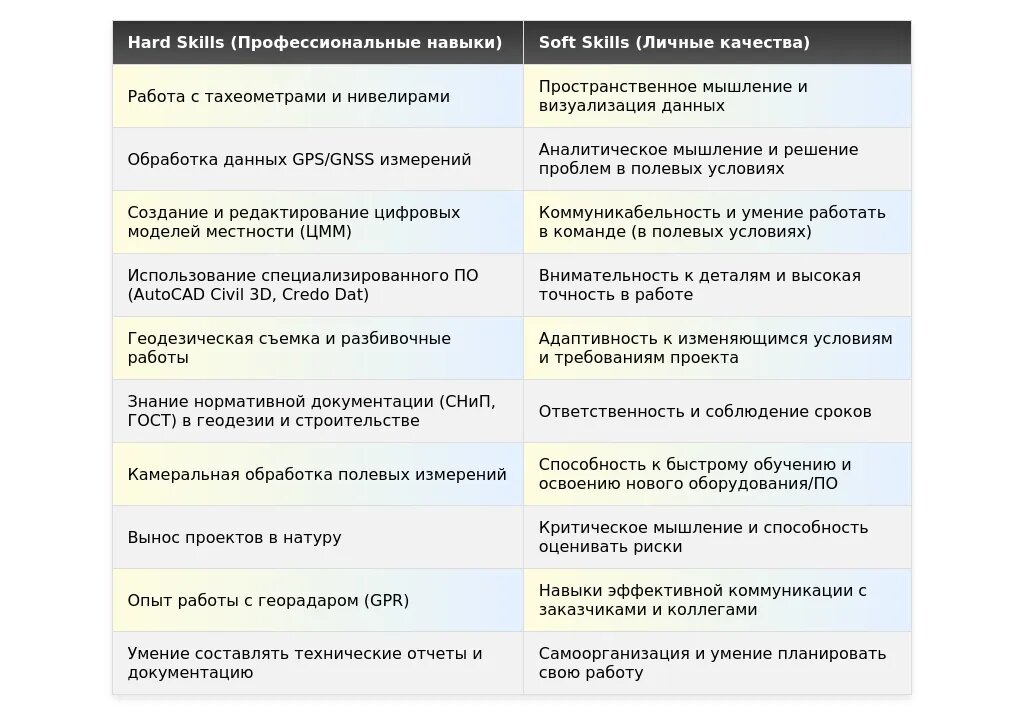 - Землеустройство: "Межевание земельных участков", "Определение границ", "Подготовка технических планов", "Работа с GPS-оборудованием", "Знание земельного законодательства".