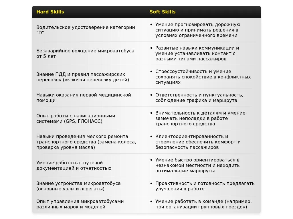 - Отсутствие конкретики: Не указана категория водительского удостоверения, опыт работы на микроавтобусах.