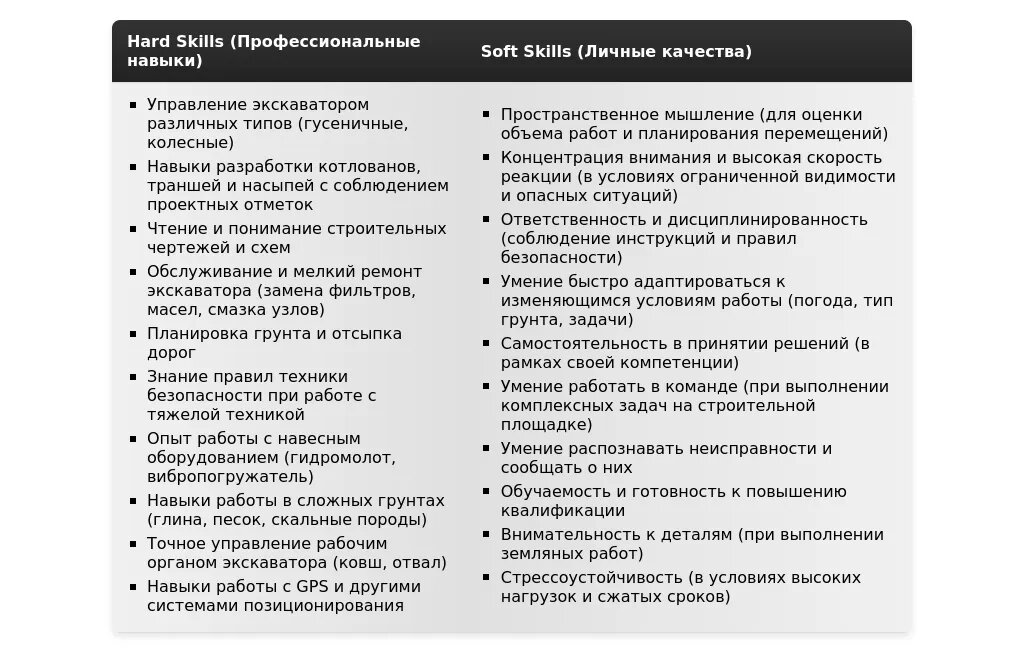 - Какую информацию обязательно включить:Ключевые навыки (например, управление различными типами экскаваторов, знание техники безопасности).