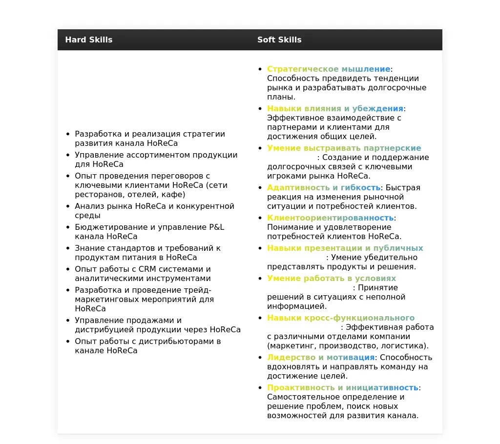 Ключевые навыки и компетенции, релевантные для HoReCa (например, опыт работы с сетями, знание рынка, навыки продаж и переговоров).