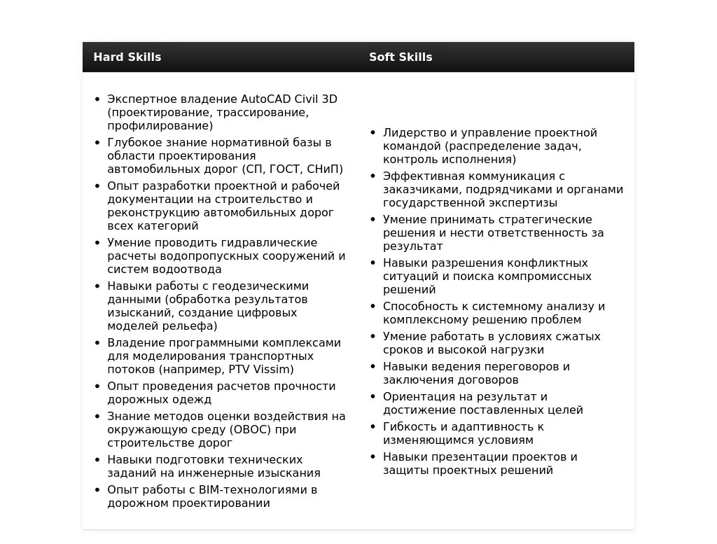 - На какие качества и навыки делать акцент: Знание нормативной базы, владение специализированным ПО (AutoCAD Civil 3D, CREDO), умение работать с технической документацией, аналитические способности.