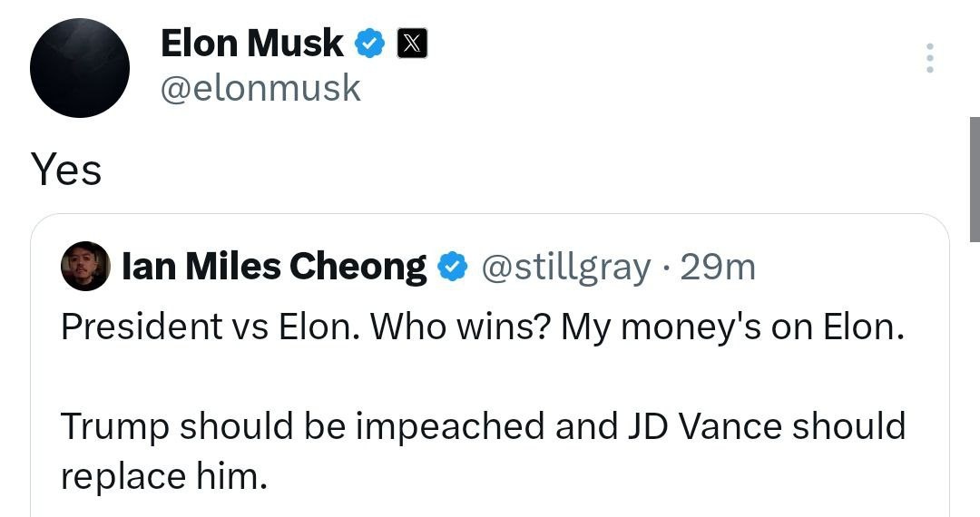 Elon with a simple 'yes' to post calling for Trump to be IMPEACHED