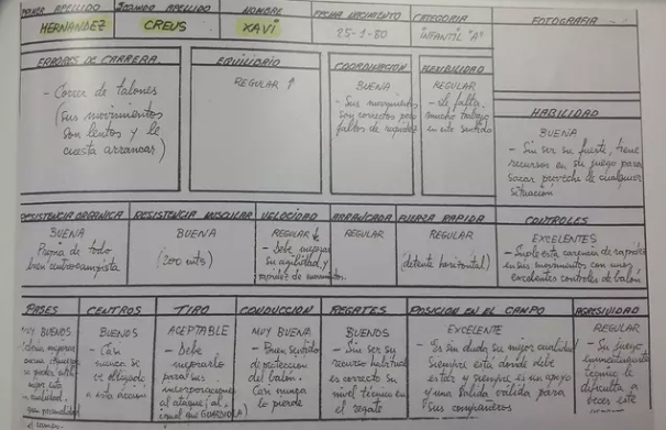 Легендарный хавбек «Барселоны» Хави присоединился к Ла Масии в возрасте 11 лет. Кристиан Мартин в 2019 году в книге La Masia: Developing people beyond sport показал скаутский отчет, который подготовили, когда испанцу было уже четырнадцать. Бег [общая форма]: он бегает на пятках, его движения медленные, и ему трудно набирать скорость; Баланс: средний; Координация: хорошая. Его движения правильные, но им не хватает скорости; Гибкость: средняя. Ему нужно много работать над этим; Мастерство: хорошее, но не его сильная сторона. Он обладает ресурсами, позволяющими ему извлекать выгоду из любой ситуации; Физическая подготовка: хорошая. У него есть все, что нужно хорошему полузащитнику; Мышечная выносливость: хорошая; Скорость: средняя. Ему нужно улучшить ловкость и скорость движений; Стартовая скорость: средняя; Контроль: отличный. Он компенсирует недостаток скорости в движениях исключительным контролем мяча; Пас: очень хороший. Ему нужно улучшить игру левой ногой, но это его сильная сторона