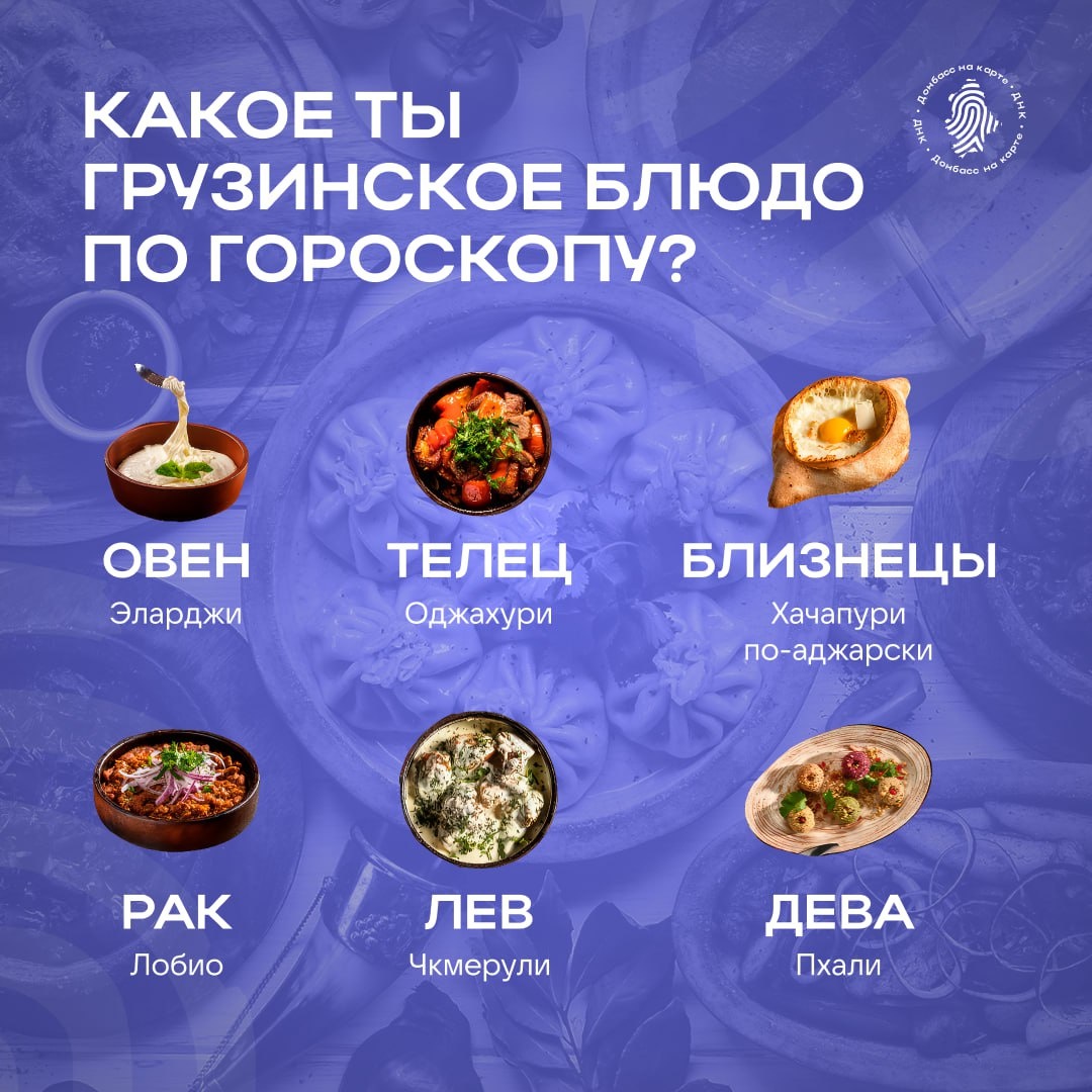 Пикантный, как рулетики из баклажанов, или нежный, как хачапури? Ищите свой знак зодиака, чтобы наконец-то ответить себе на вопрос: «Зачем? Почему? Какое я грузинское блюдо по гороскопу?» А еще мы рассказывали, кто какая булочка, тоже полистайте 👀 Подписаться | Донбасс на карте
