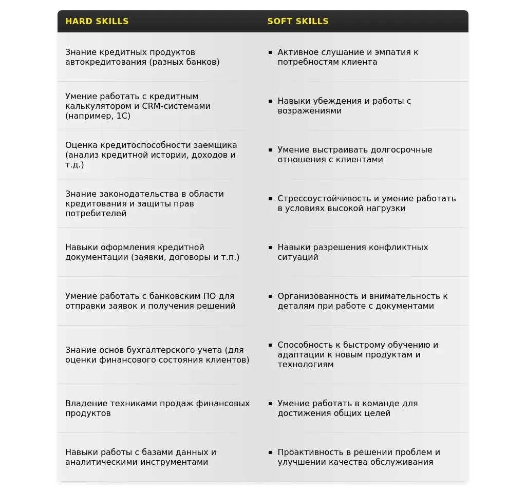 Ключевые навыки, релевантные для кредитного специалиста в автосалоне.