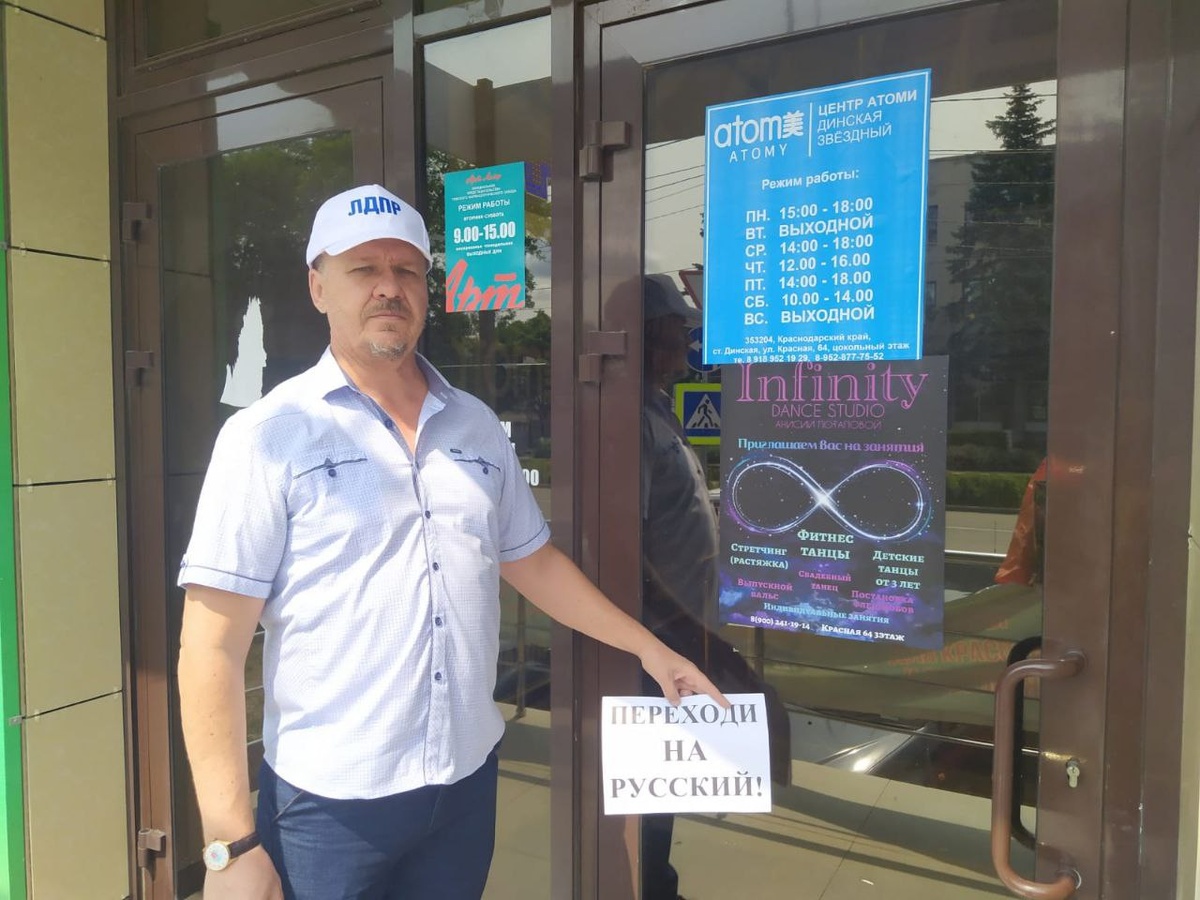 Депутат Совета Динского сельского поселения Динского района Андрей Иванович Кисилевич и помощник координатора Динского местного отделения ЛДПР Вероника Александровна Абашеева провели одиночные пикеты с призывом размещать надписи на русском языке рядом с вывесками на латинице.