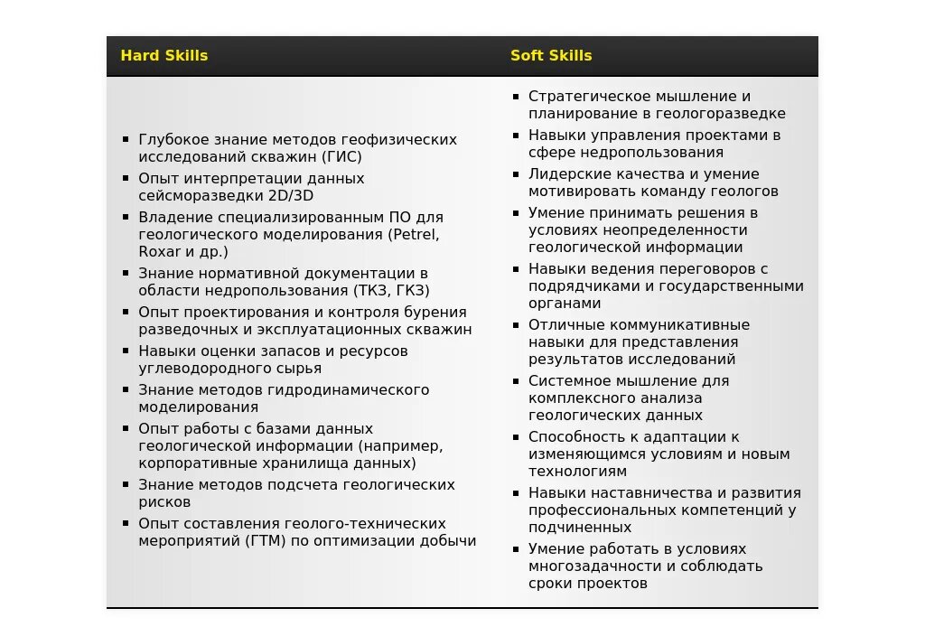 - На какие качества и навыки делать акцент: Аналитические способности, внимание к деталям, умение работать с геологической информацией, знание профильного ПО (ArcGIS, Petrel, Leapfrog Geo), готовность к полевым работам.