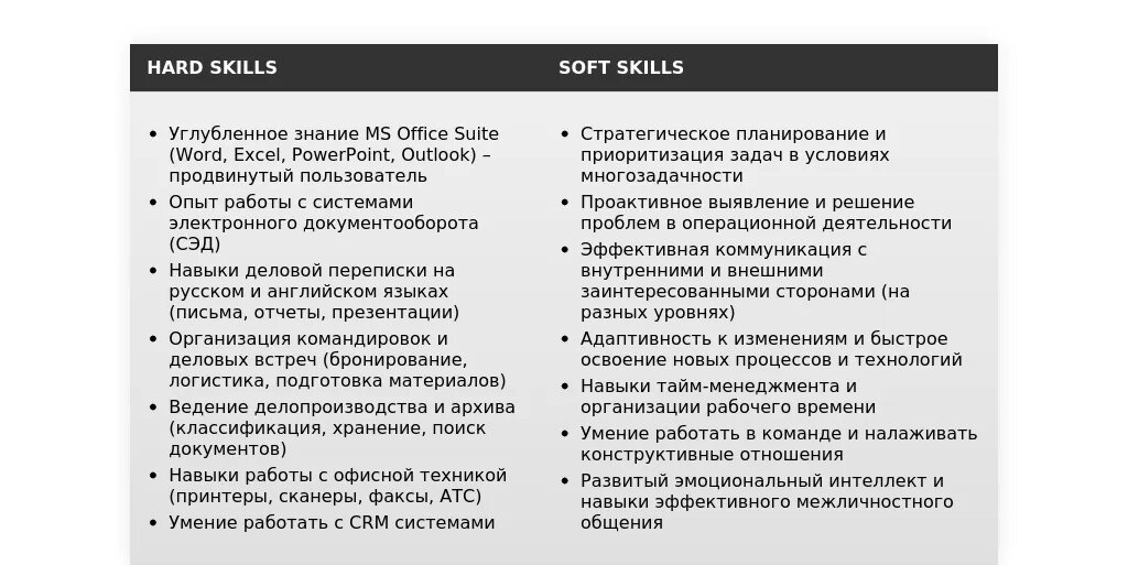 - Сгруппируйте навыки по категориям (например, "Работа с компьютером", "Организационные навыки", "Коммуникативные навыки").
